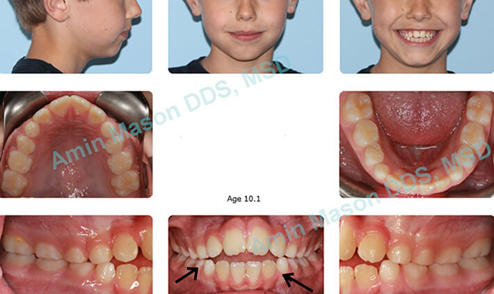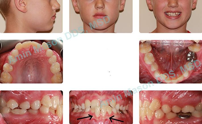 Patient presented with an open bite due to thumb sucking habit. Sucking habit was stopped, and the bite was closed during phase I treatment. After the patient lost all of their primary (baby) teeth, patient was evaluated for the second phase. Parents chose not to pursue 2nd phase of treatment as they were happy with the phase I results.