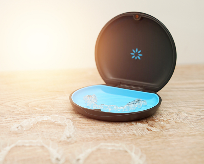 In addition to rinsing your aligners after mealtimes, you should give them a more thorough cleaning each night. You can use Invisalign cleaning crystals to get rid of harmful bacteria, reduce the risk of unwanted odors, and keep your aligners looking their best. Alternatively, you could use a denture-cleansing formula to soak your aligners for 20 minutes or so.